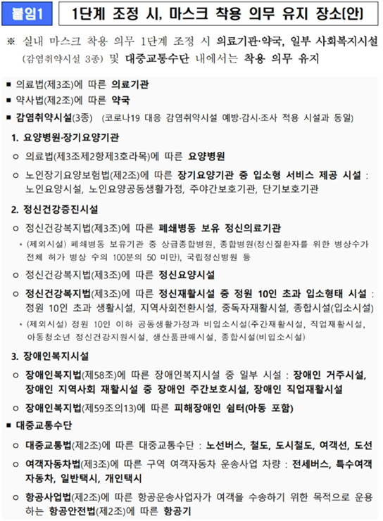 정부에서 1단계 로 조정한 내용은 다음과 같습니다. 감영에 취약한 시설과 대중교통은 마스크 착용 의무화 장소로 지정되어 있습니다. 세부 내용은 다음과 같습니다.