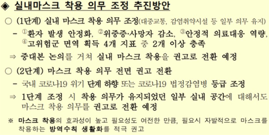 현재 추진하고 있는 1단계에서는 의료기관, 대중교통에서 마스크 착용 의무를 유지하고 있습니다. 이를 통해 코로나19가 추후 점차적으로 안정화 되면 2단계를 추진하여 실내 전 지역에서 마스크를 해제할 수 있도록 추진한다고 합니다.